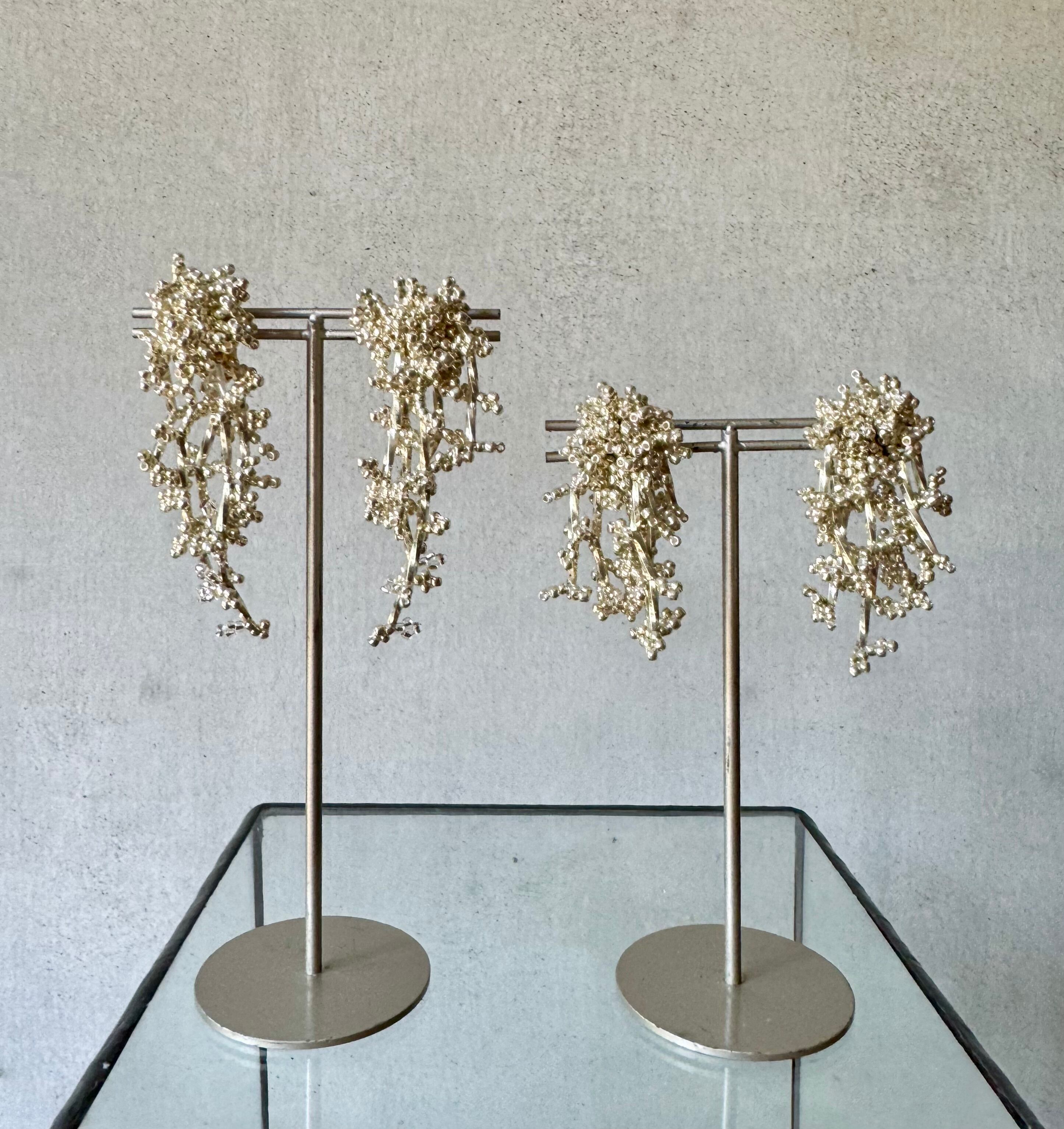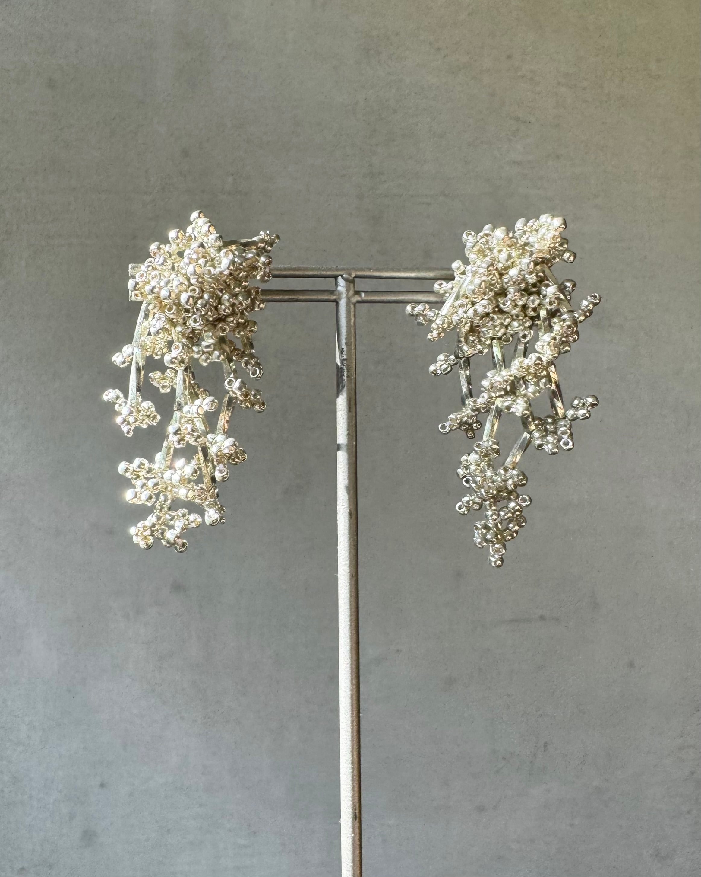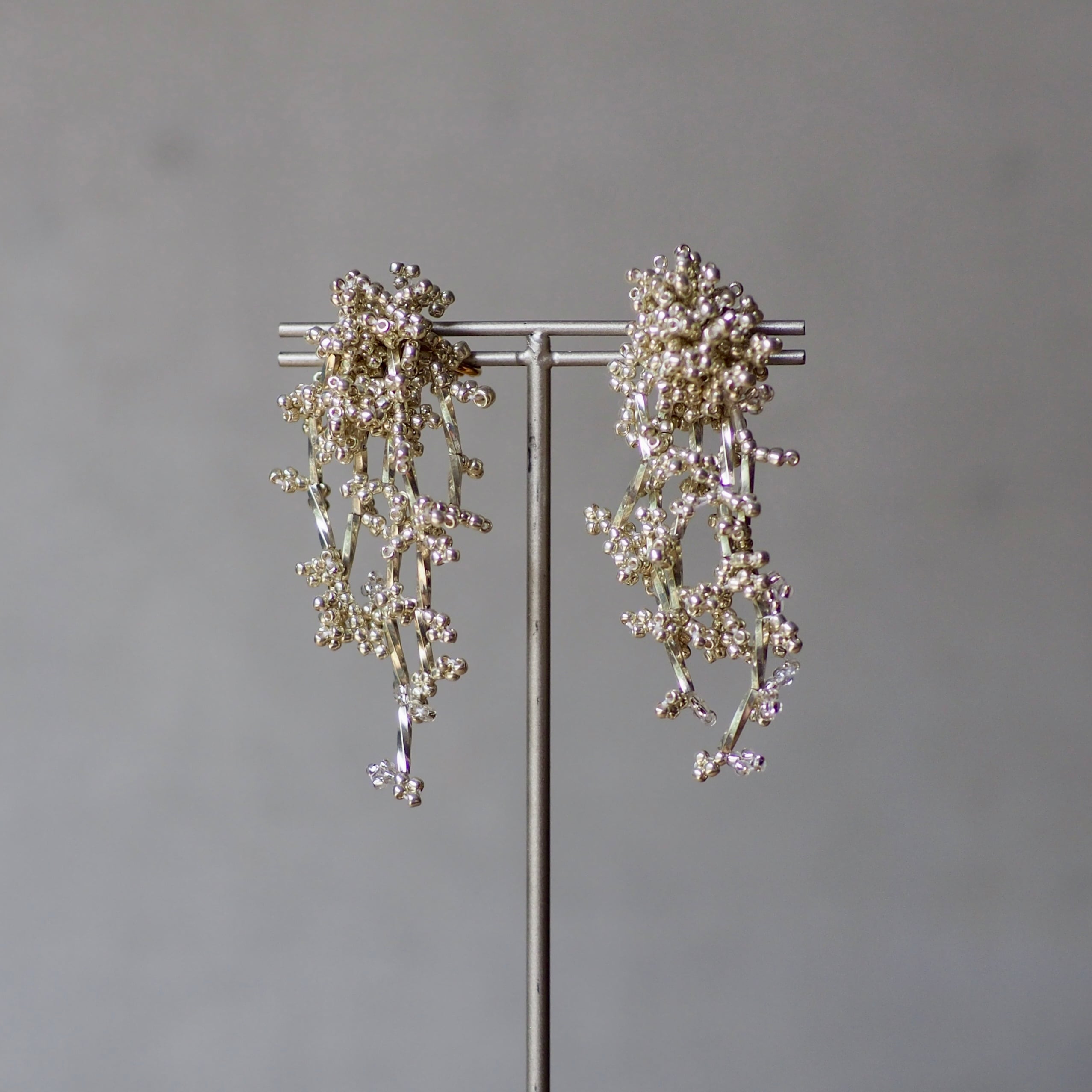 メタリックビーズを編み上げた立体のレースのように、軽やかで上品な耳飾りです。