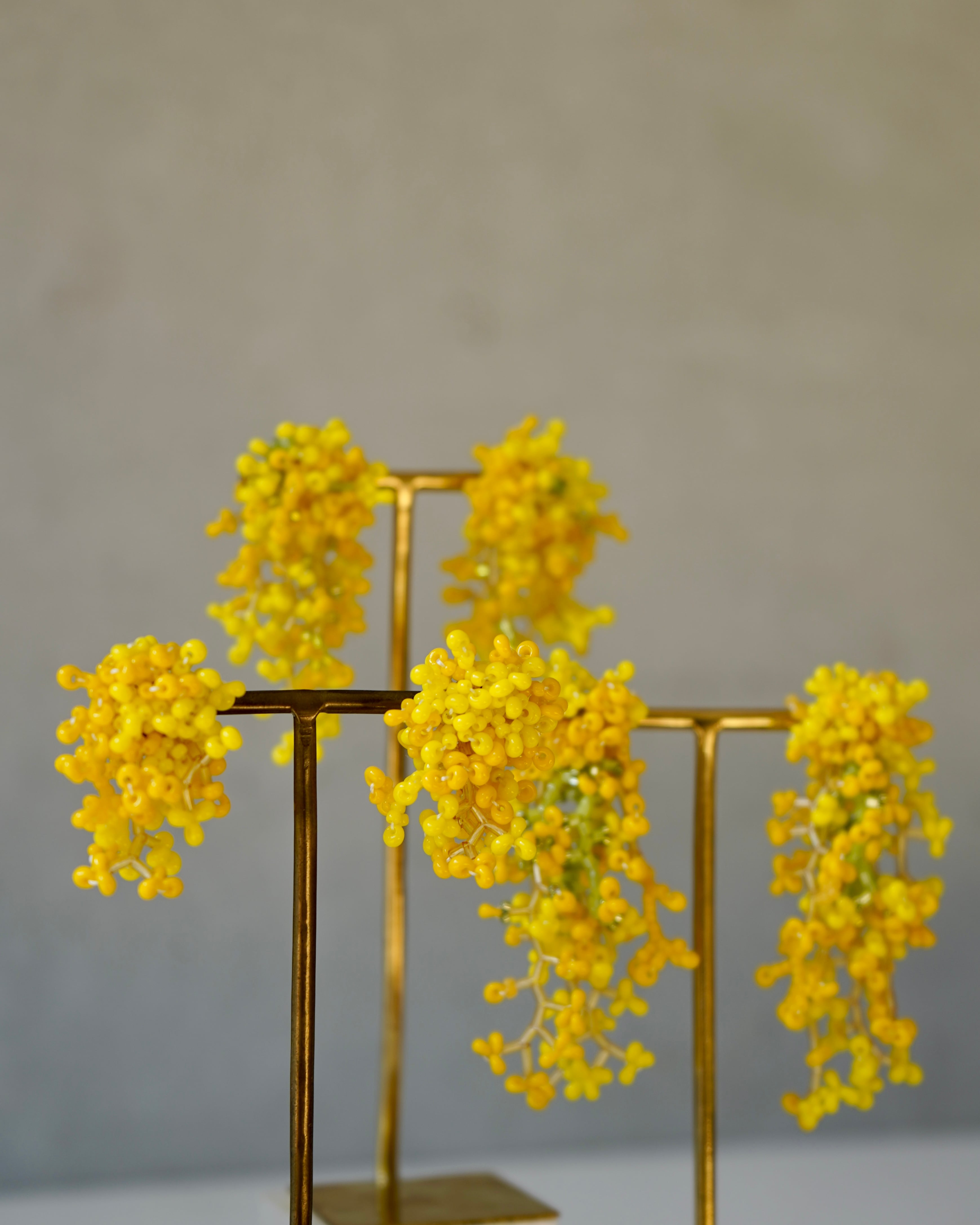 やわらかな光を含んだ2色のミモザイエローを、植物の枝のように連ねた