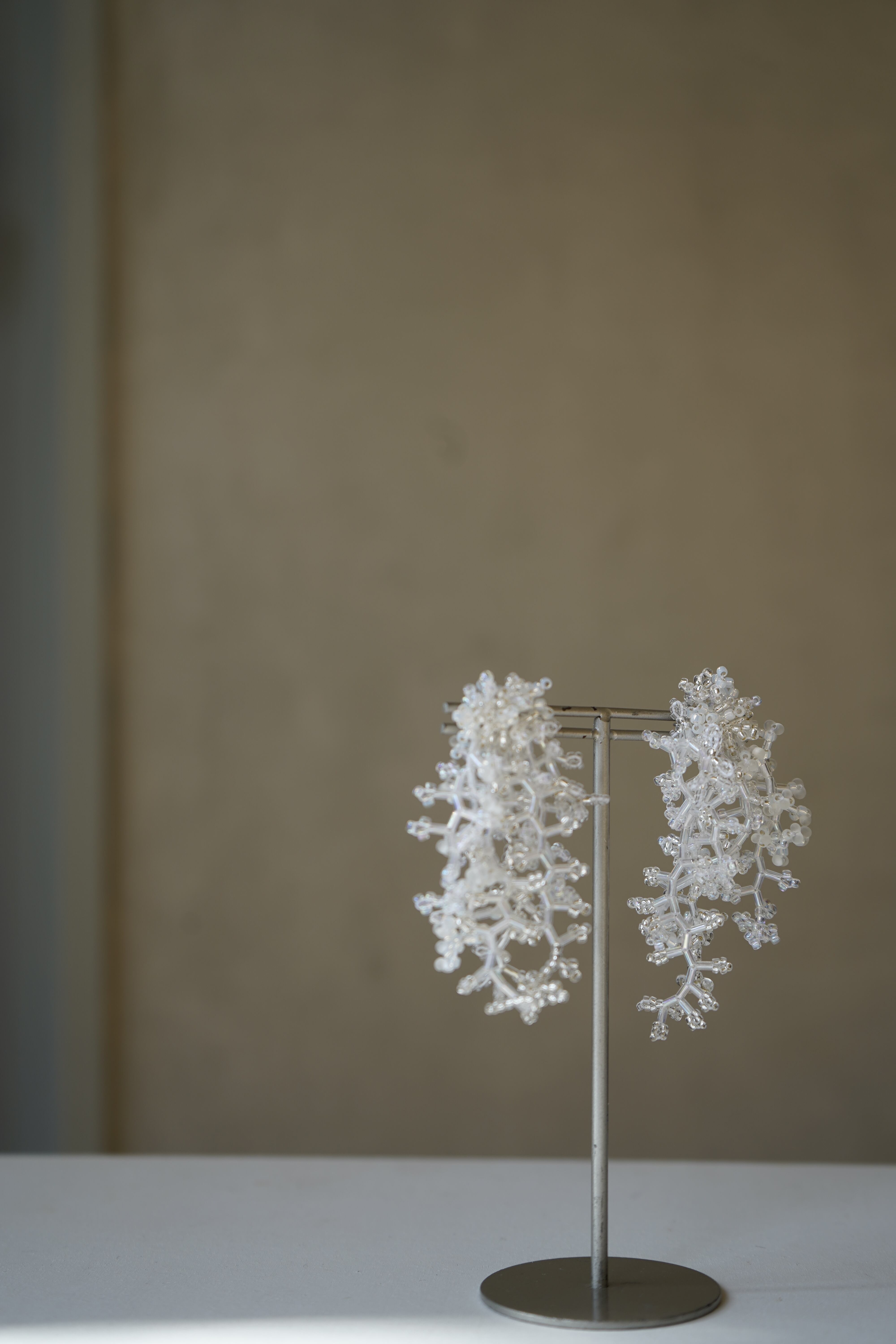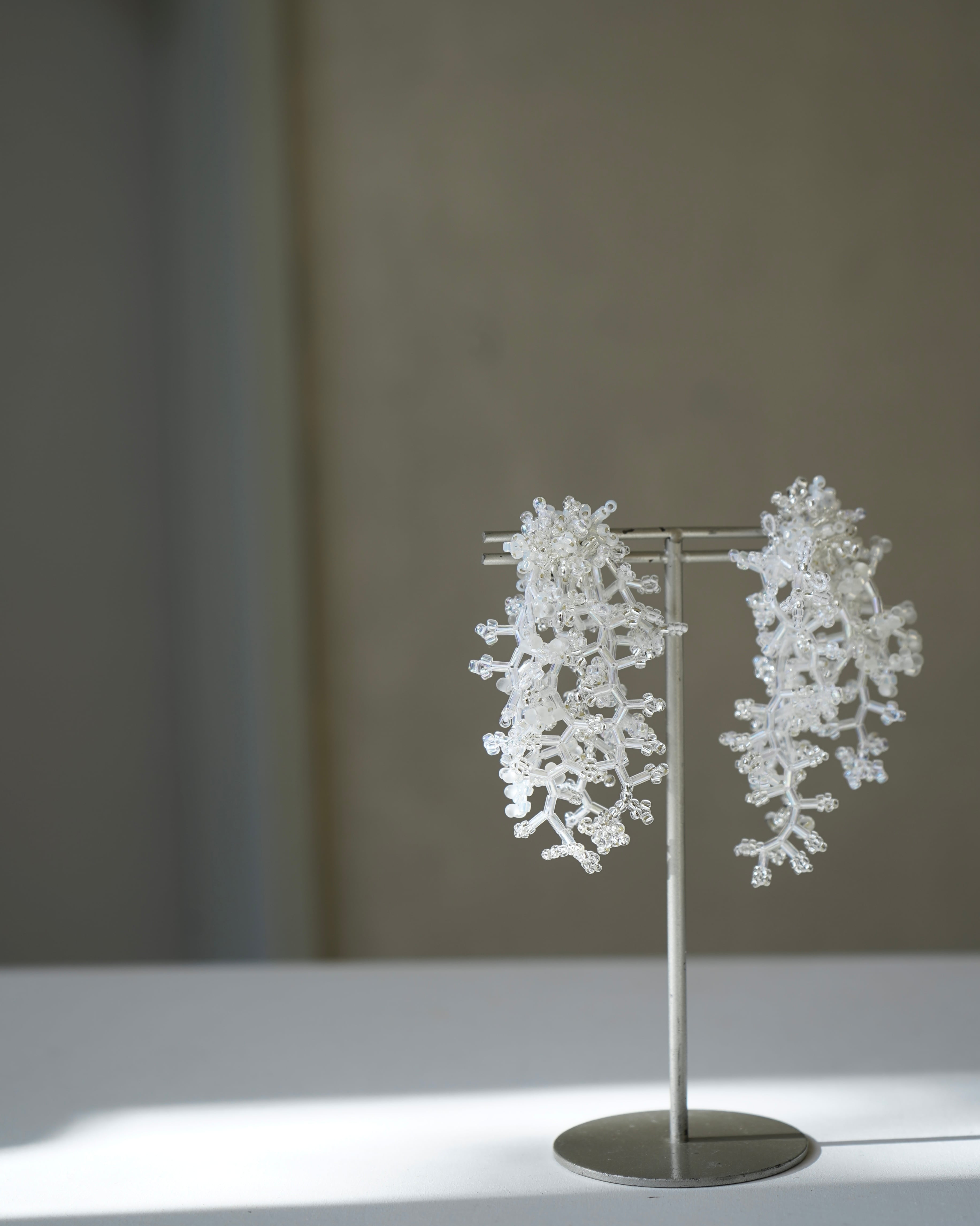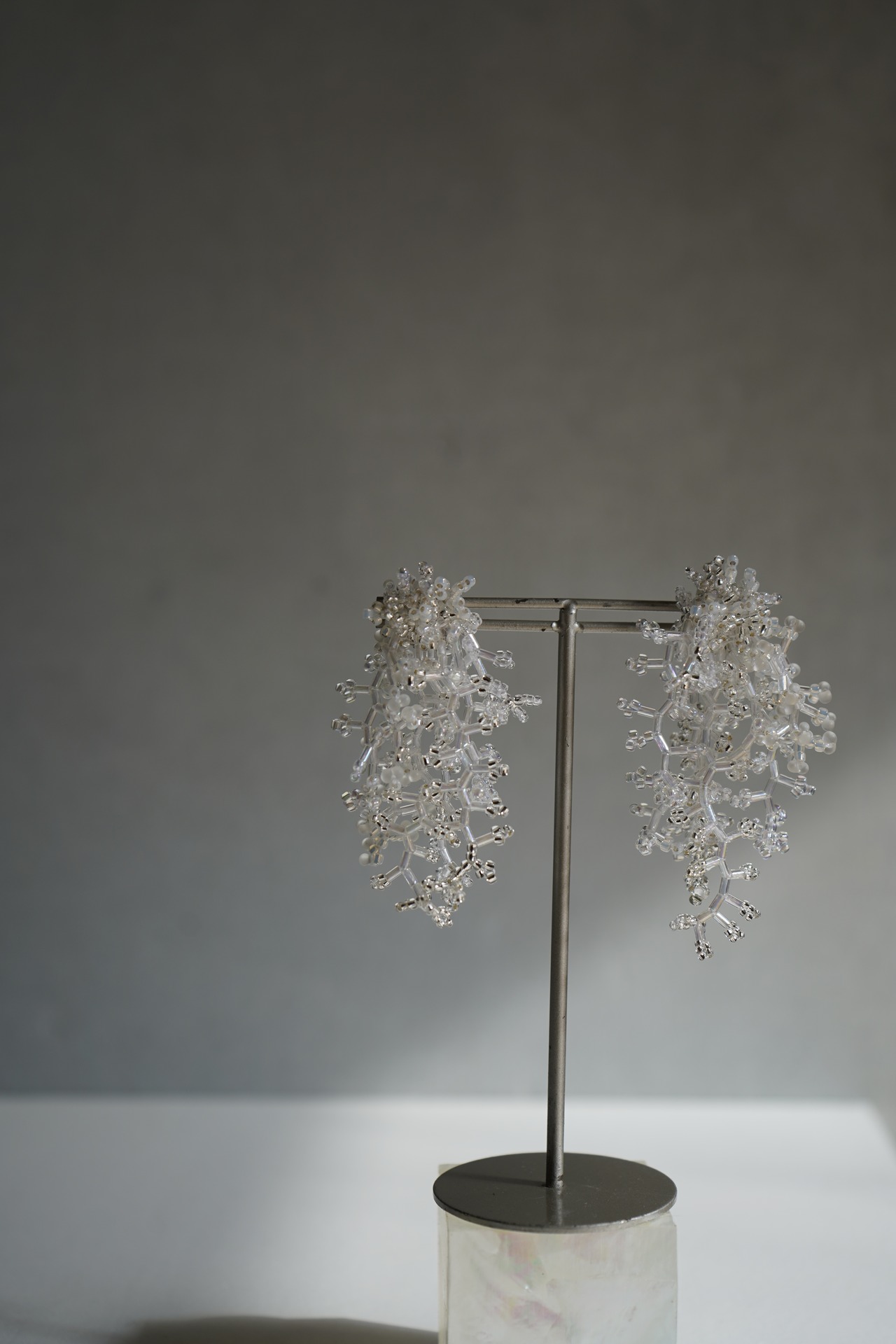 透き通る透明感と、光を反射する少しのメタリック、すりガラスのようなセミマットビーズを組み合わせた、ガラスビーズの良さを活かした、透明感たっぷりの耳飾りです。
