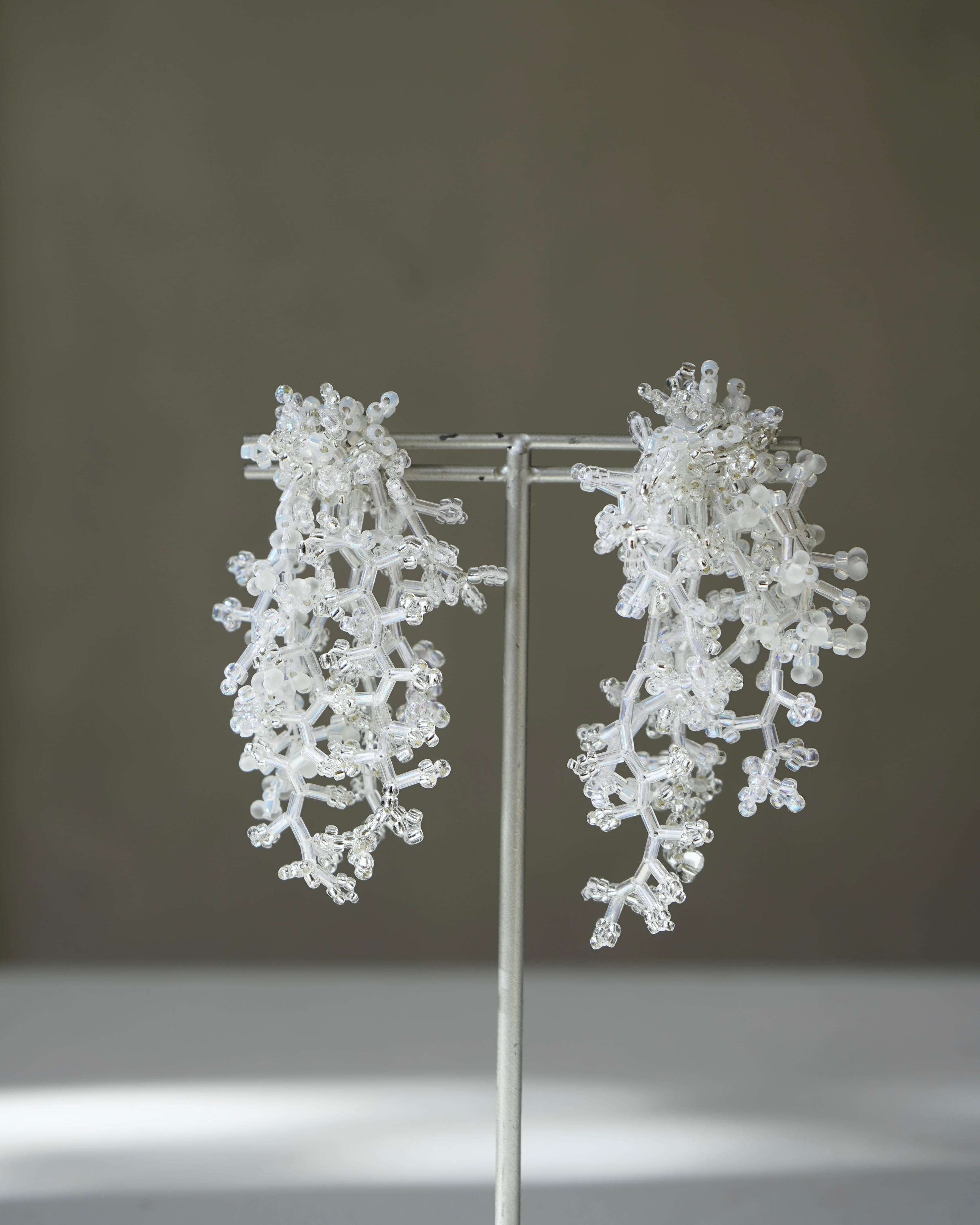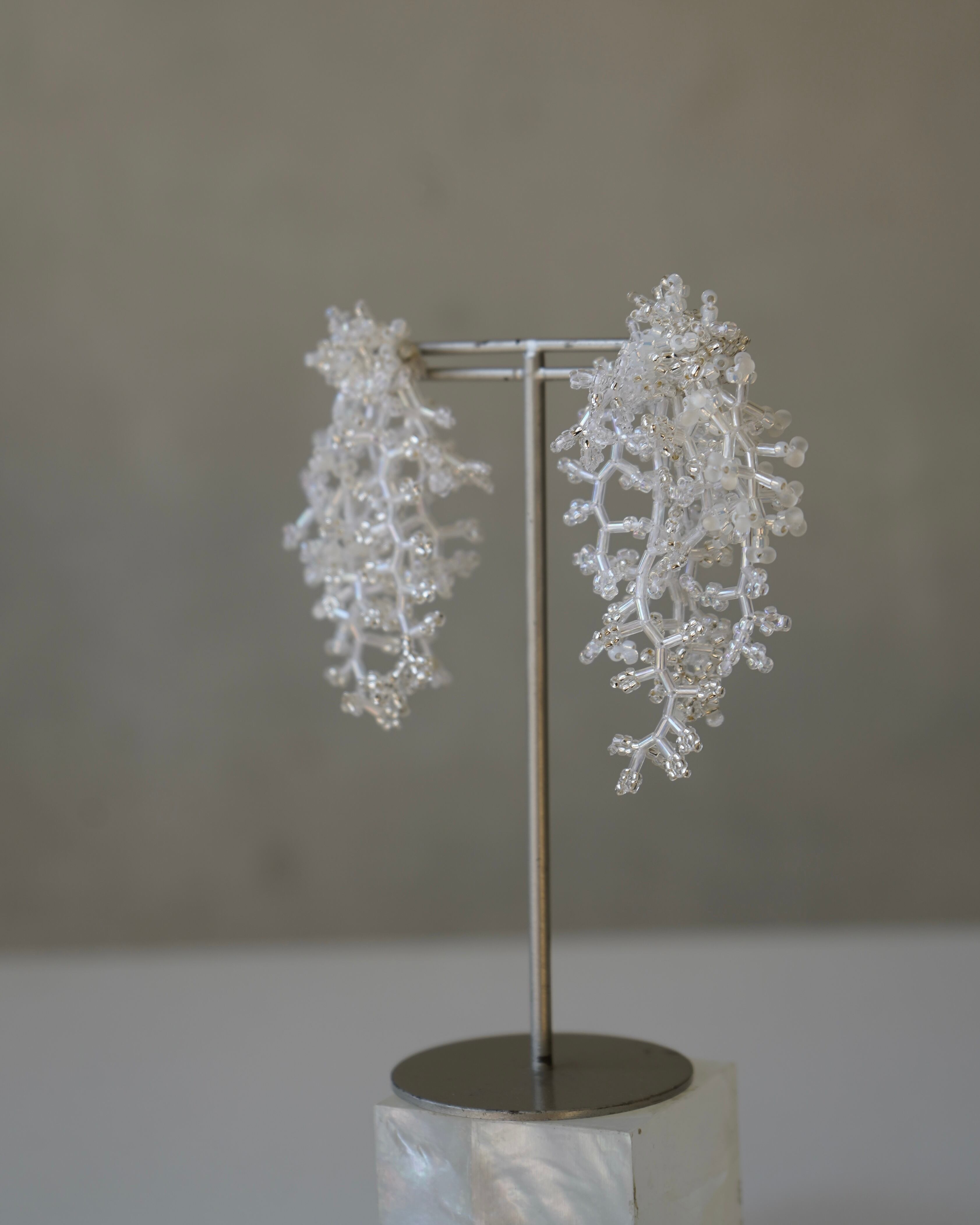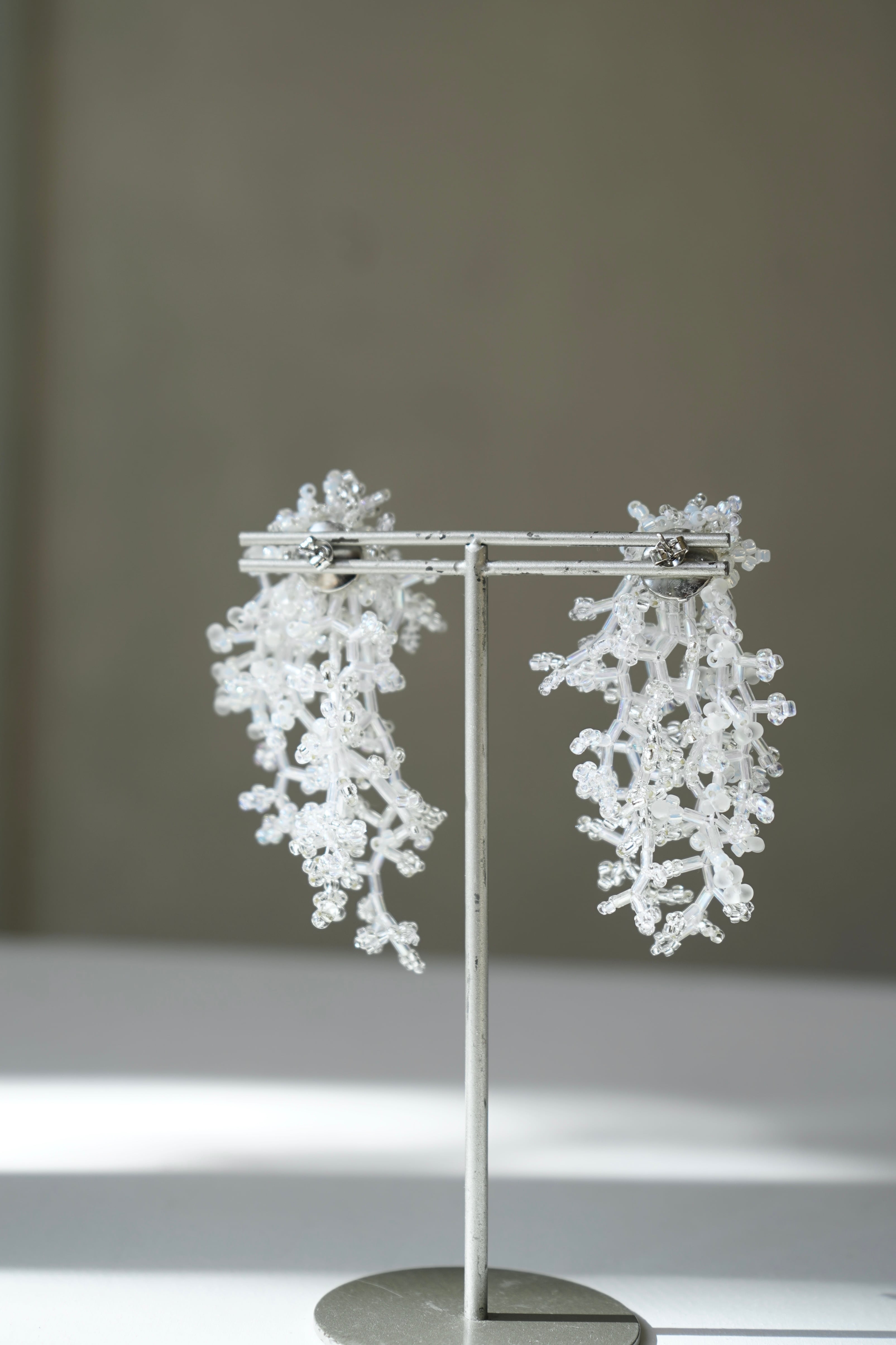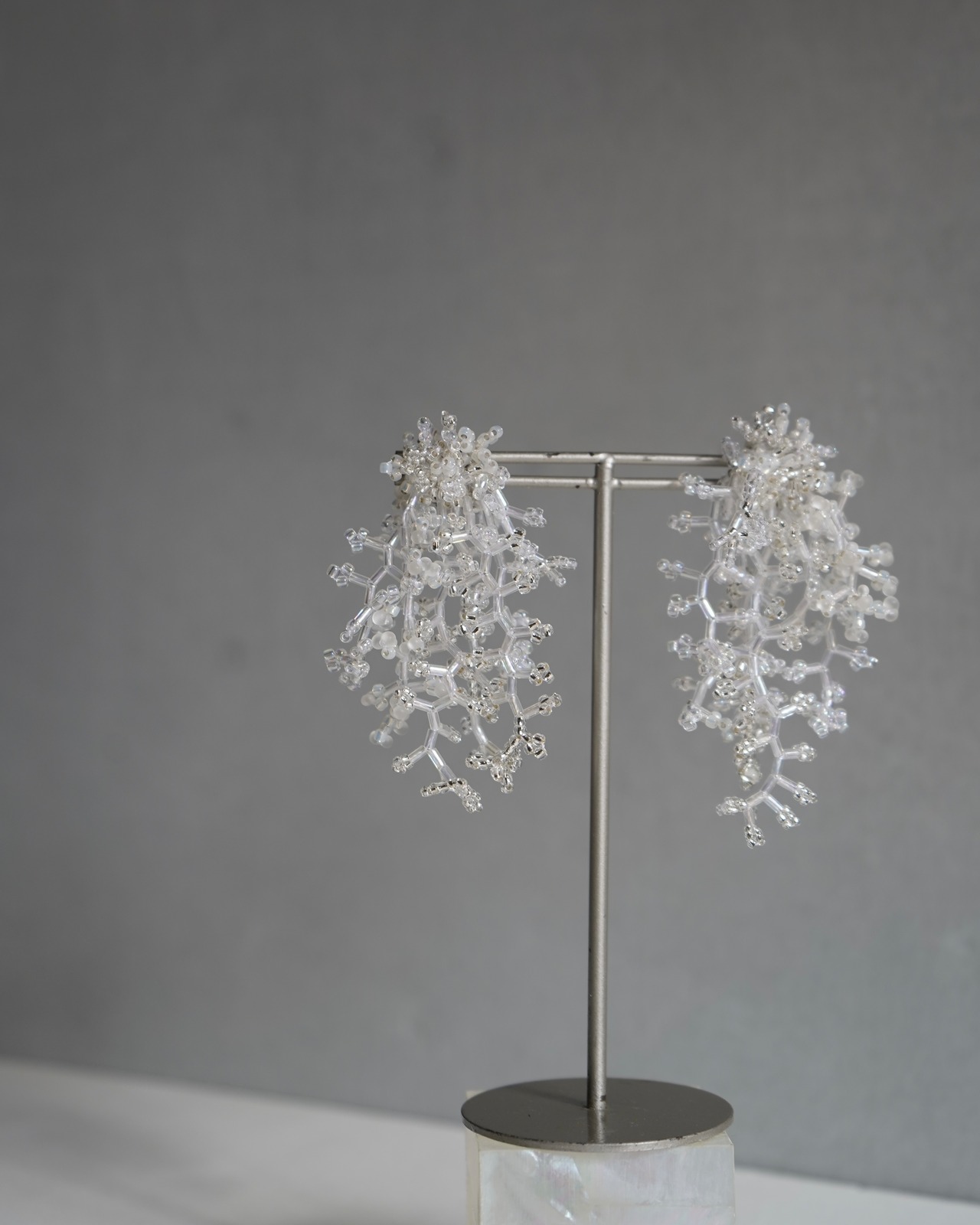透き通る透明感と、光を反射する少しのメタリック、すりガラスのようなセミマットビーズを組み合わせた、ガラスビーズの良さを活かした、透明感たっぷりの耳飾りです。