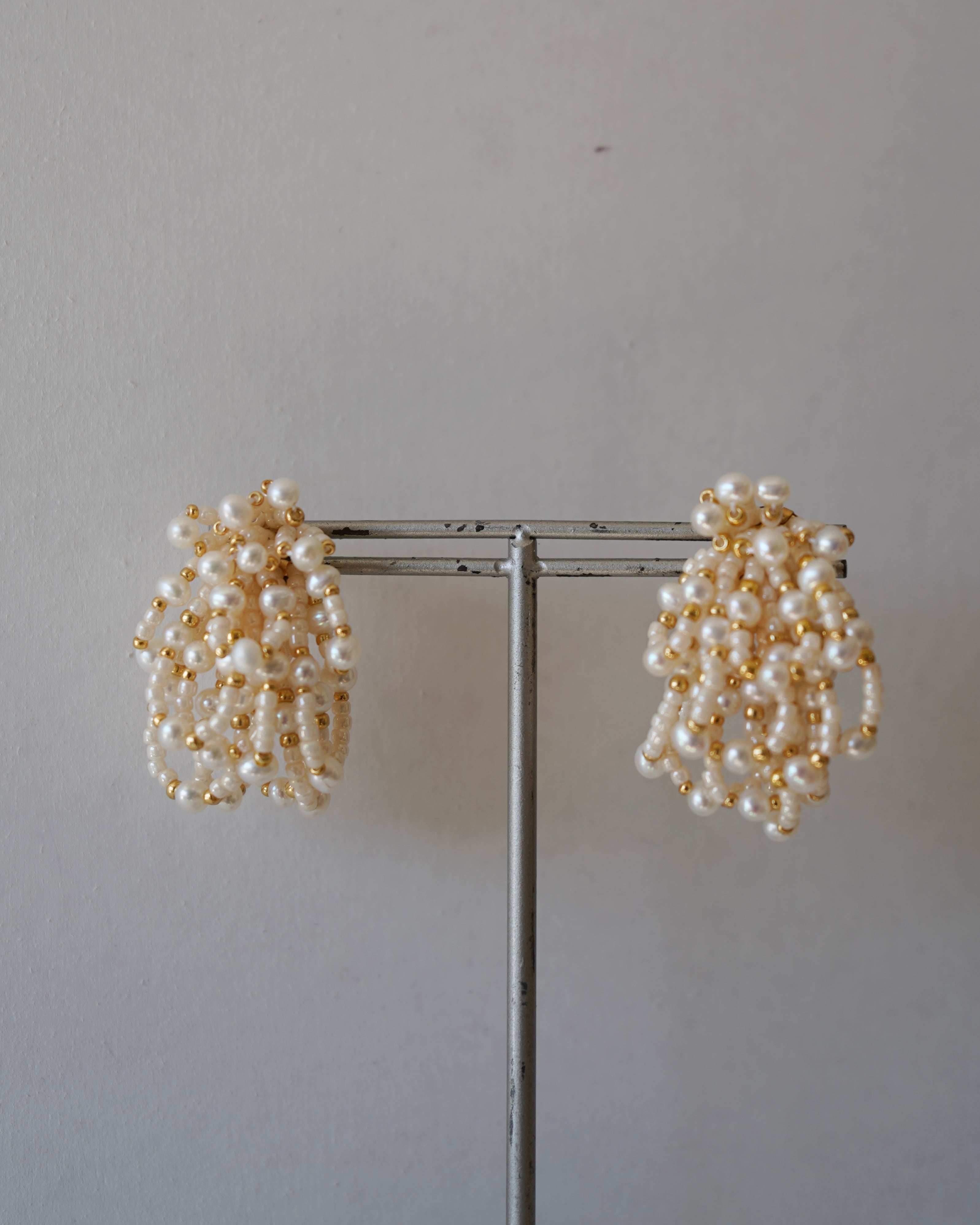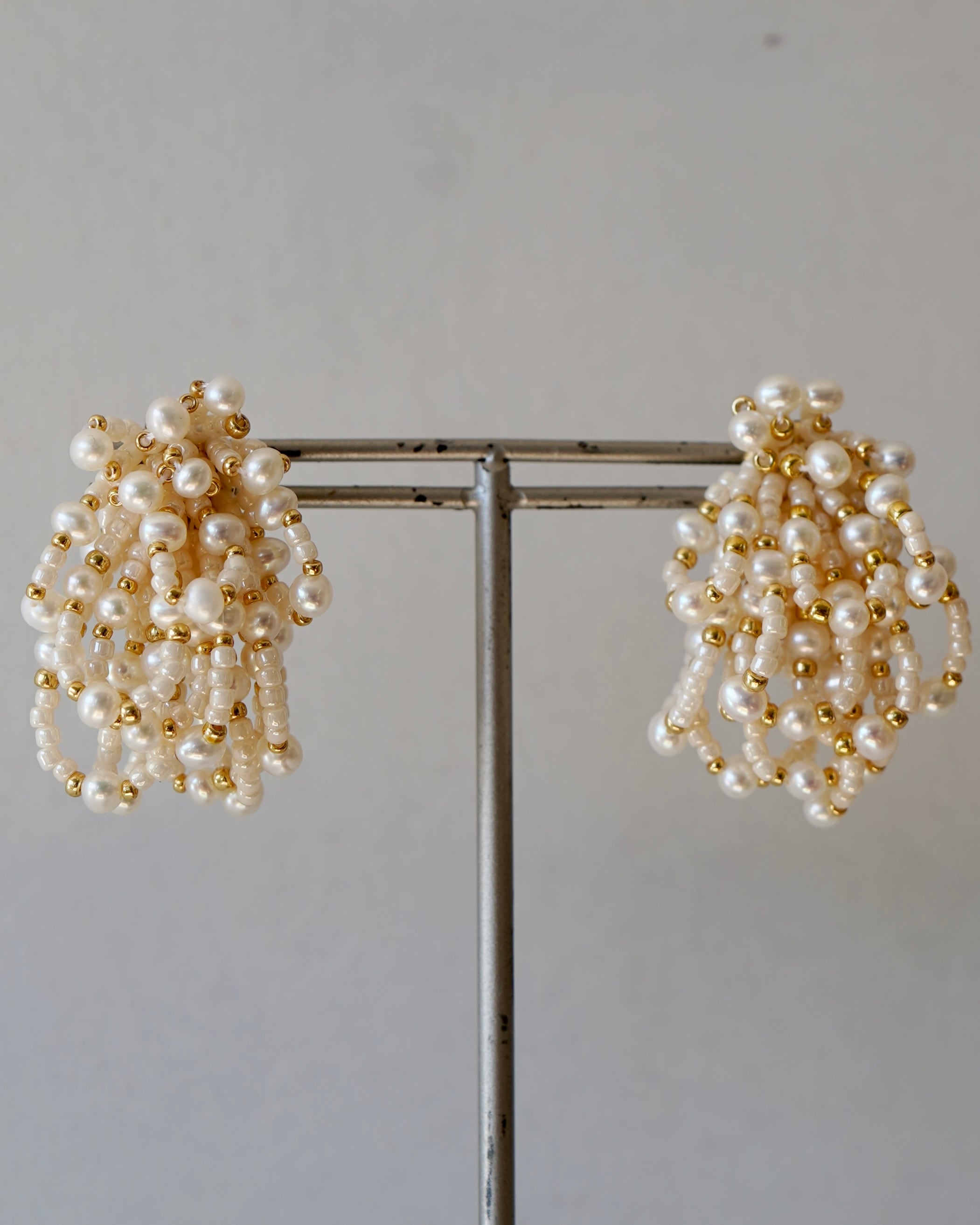 極小ビーズと極小粒のバロック淡水パールをビーズ専用の強化糸で編み、立体感とほどよいボリュームを持たせました。
